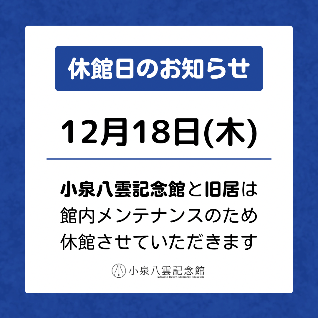 The Lafcadio Hearn Memorial Museum and Former Residence will be closed on Thursday December 18th for maintenance work.