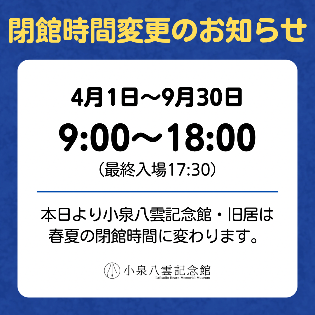 2025年4月1日より、小泉八雲記念館・小泉八雲旧居の開館時間を変更・入館料を改定いたします。